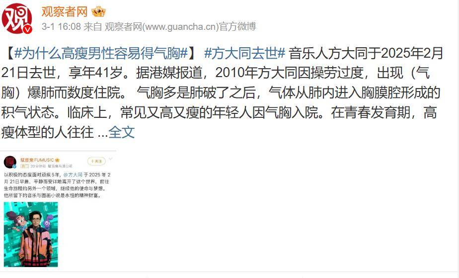 歌手方大同传出了死讯,很多人都不敢相信,他前一周才发布了专辑,后一周就离开了人世。