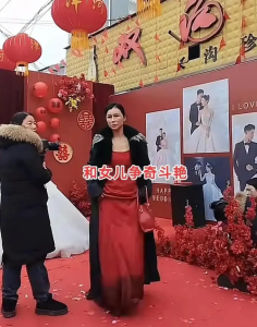 视频中的婚礼现场,氛围本就十分安静,新人与亲友们有序准备合影,新娘低头站立,神情温顺,并未过多张扬。可当新娘的妈妈一出现,瞬间吸引了所有人的目光,与现场的低调格格不入。她身着一件红色抹胸礼服,肩膀与后背完全裸露在外,浓重的口红与眼影搭配得十分抢眼,身姿挺拔地站在人群中,气场十足,仿佛下一秒就要走上红毯,而非出席女儿的婚礼。
