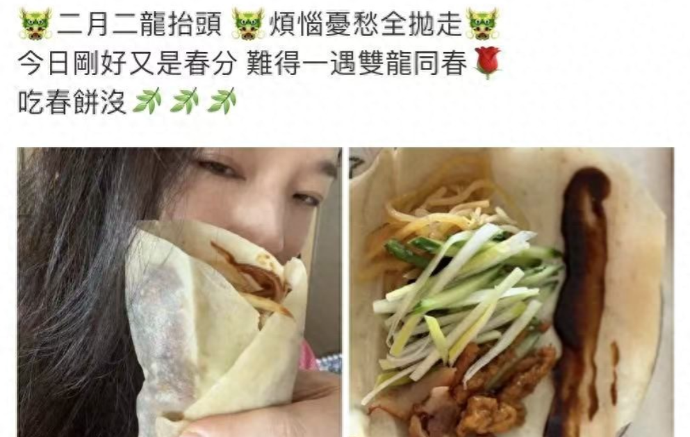 烙好的春饼薄而不破,透着淡淡的麦香,舒淇还搭配了韭菜、豆芽、鸡蛋等经典配菜,卷起来咬一口,满是春日的清爽。她在配文中写道:“二月二,龙抬头,吃龙鳞,抛烦恼,愿新的一年,平安顺遂,喜乐无忧。”话语简单直白,却藏着最朴素的心愿。这组日常曝光后,网友纷纷留言互动,有人说“舒淇也太会做了,看着就有食欲”,也有人表示“跟着舒淇学做春饼,沾沾龙气,抛掉烦恼”。